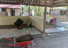 Barito Selatan – Satgas TMMD Kodim 1012/Buntok menunjukkan keterampilan dalam memasang keramik di pasar Desa Talio, Kecamatan Karau Kuala, Kabupaten …