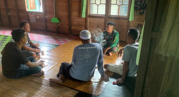 Barito Selatan – Disela Isitirahat, Pasi Ter Dim 1012/Buntok Lettu Cpl Arif Setyawan melaksanakan Komsos(Komunikasi Sosial) di Lokasi TMMD Reguler Ke-124 Kodim 1012/Buntok kepada Masyarakat, Bertemoat di Rumah warga Desa Talio, Kecamatan Karau Kuala, Kabupaten Barito Selatan, Pada hari Rabu (21/05/2025)
