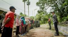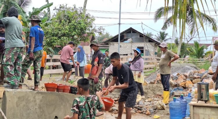 Kolaborasi antara prajurit berseragam loreng dan masyarakat dengan pakaian keseharian menciptakan sinergi yang harmonis dalam menyelesaikan sasaran fisik TMMD.