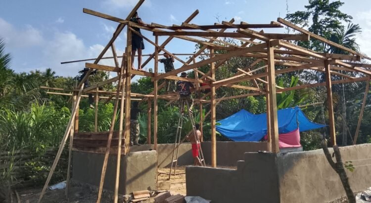 Personel Satgas TMMD bersama masyarakat setempat bahu-membahu mengangkat dan memasang balok-balok kayu di bagian atas dinding bangunan sebagai rangka atap rumah.