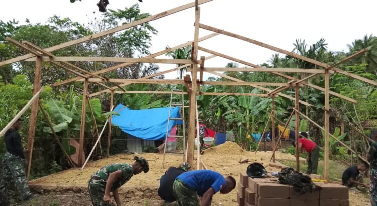 KENDARI – Semangat kemanunggalan TNI dan rakyat terasa kuat di lokasi TMMD ke-127 saat personel Kodim 1417/Kendari bersama warga bahu-membahu mendirikan rangka rumah RTLH di Sambuli dan Petoaha, Rabu (4/3).