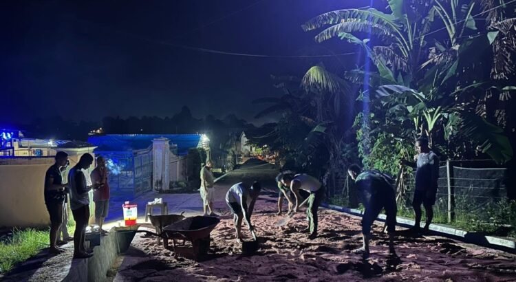 Dengan penerangan lampu seadanya, anggota Satgas bekerja penuh konsentrasi. Setiap ayunan sekop dan perataan pasir dilakukan secara teliti agar hasil akhir memiliki kualitas yang maksimal dan tahan lama.