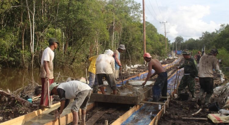 Barito Selatan, 2 Juni 2025 – Dalam terik matahari yang menyengat, prajurit TNI dari Satgas TMMD Reguler Ke-124 Kodim 1012/Buntok bersama warga tetap bersemangat mengaduk semen secara manual untuk membangun jalan rabat beton di Desa Talio, Kecamatan Karau Kuala, Kabupaten Barito Selatan.