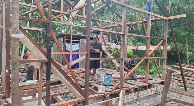 Barito Selatan – Pengerjaan Rumah Tidak Layak Huni (RTLH) di Desa Wungkur Baru, Kecamatan Gunung Bintang Awai, yang merupakan salah satu sasaran fisik TMMD Reguler ke-124 Kodim 1012/Buntok, kini telah memasuki tahap pemasangan rangka rumah berbahan kayu, Selasa (20/05/2025).
