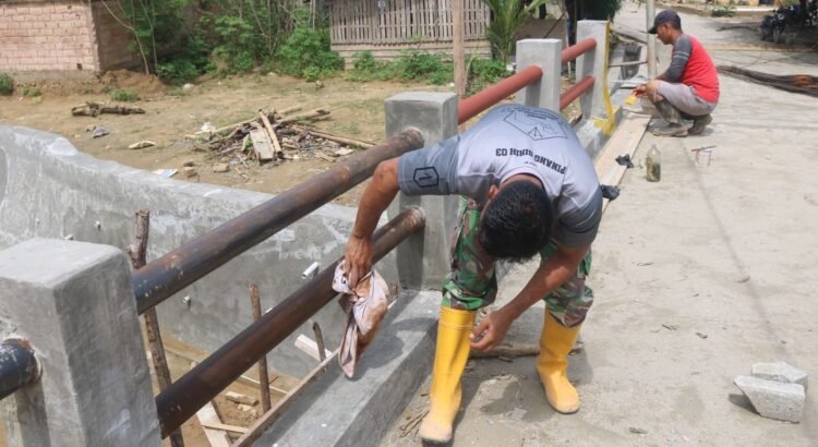 Dalam kegiatan tersebut, para prajurit TNI bersama warga setempat bergotong royong mengecat pagar pembatas jembatan agar terlihat lebih rapi dan menarik.