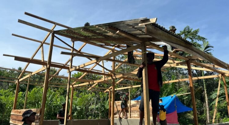 Para prajurit TNI bersama masyarakat tampak bekerja sama mengangkat dan memasang material bangunan agar konstruksi rumah dapat segera terbentuk.