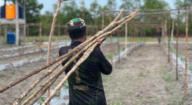 Pembuatan tempat rambatan dilakukan dengan memperhatikan kekokohan dan fungsionalitas agar tanaman sayur dapat merambat dengan baik dan hasil panen meningkat. Upaya ini menunjukkan komitmen Satgas dalam mendukung ketahanan pangan dan kesejahteraan masyarakat.