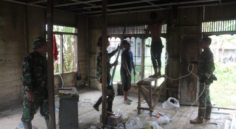 Pengerjaan dilakukan secara gotong royong antara personel Satgas TMMD dan warga setempat, yang menunjukkan kuatnya sinergi antara TNI dan masyarakat dalam membangun desa. Proses pemasangan kerangka plafon ini merupakan salah satu tahap penting dalam penyelesaian bangunan agar rumah lebih layak dan nyaman untuk dihuni.