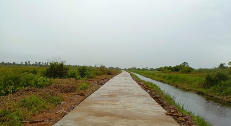 Mempawah — Meski diguyur hujan lebat, kondisi jalan rambat beton hasil pembangunan Satgas TMMD Reguler ke-124 Kodim 1201/Mempawah tetap dalam kondisi prima dan mantap. Jalan tersebut dibangun sebagai salah satu sasaran fisik utama TMMD yang menghubungkan permukiman warga dengan lahan pertanian di Desa Purun Kecil, Kecamatan Sungai Pinyuh, Kabupaten Mempawah.