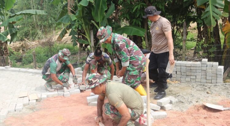 Kebersamaan tersebut tampak saat personel kedua institusi bahu-membahu memasang paving blok demi menciptakan akses jalan yang lebih layak bagi masyarakat.