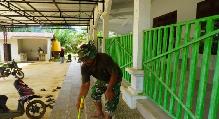 Dengan membawa peralatan kebersihan, para prajurit dan masyarakat membersihkan lantai, halaman, serta bagian dalam masjid agar siap digunakan untuk ibadah berjamaah. Semangat gotong royong begitu terasa sepanjang kegiatan berlangsung.